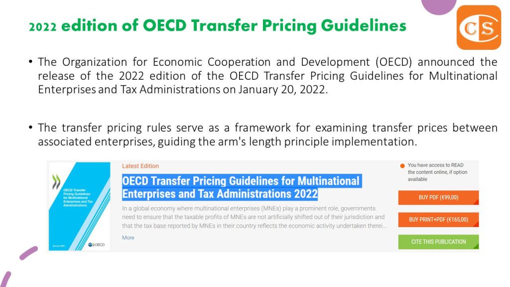 1. The Organization for Economic Cooperation and Development (OECD) announced the release of the 2022 edition of the OECD Transfer Pricing Guidelines for Multinational Enterprises and Tax Administrations on January 20, 2022.