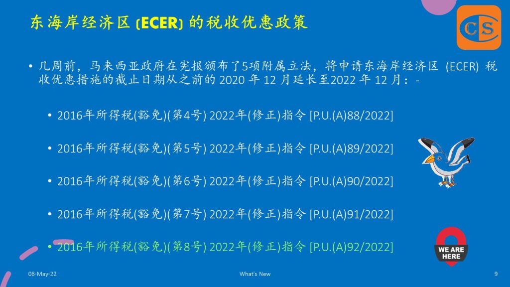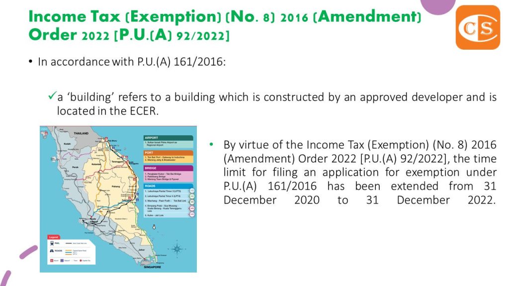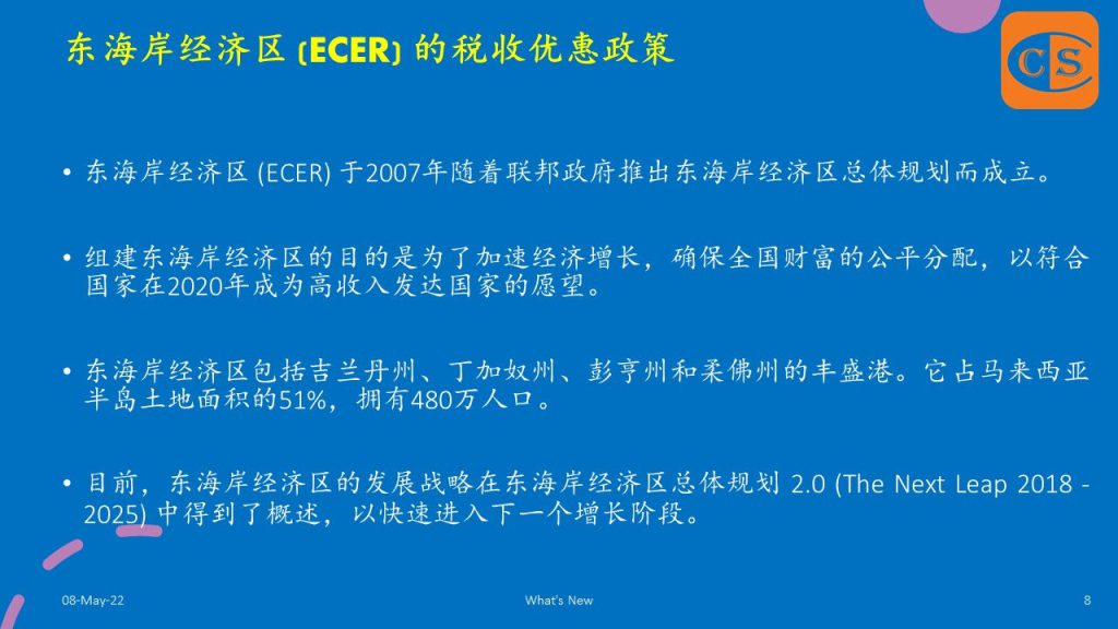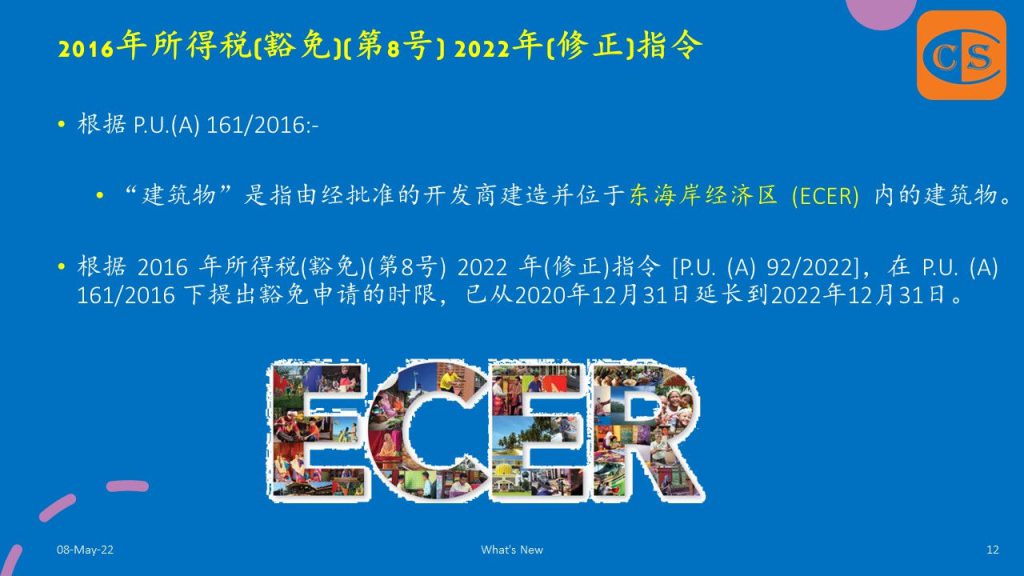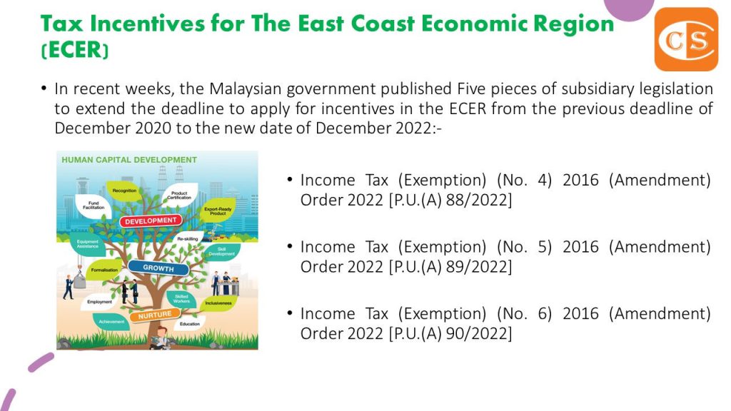4. 几周前,马来西亚政府在宪报颁布了5项附属立法,将申请东海岸经济区 (ECER) 税收优惠措施的截止日期从之前的 2020 年 12 月延长至 2022 年 12 月:-