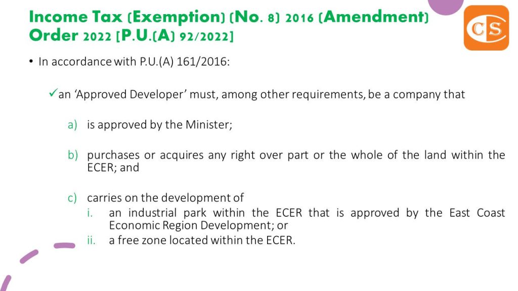 5. 2016年所得税(豁免)(第8号) 指令 (P.U.(A) 161/2016) 规定,经批准的开发商连续10年免于缴纳来自以下方面的法定收入的所得税:-