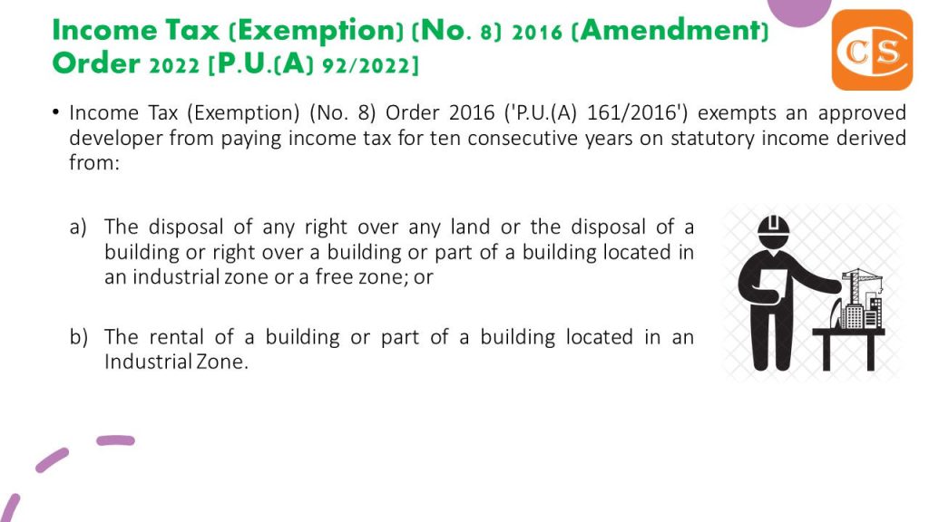 5. Income Tax (Exemption) (No. 8) Order 2016 (‘P.U.(A) 161/2016’) exempts an approved developer from paying income tax for ten consecutive years on statutory income derived from: