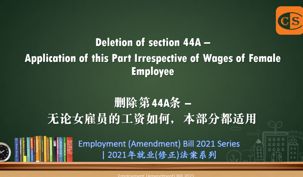 5. Some of the most significant amendments suggested to the Employment Act 1955 as a result of the Employment (Amendment) Bill 2021 (“the Bill”) include Deletion of section 44A – Application of this Part Irrespective of Wages of Female Employee.