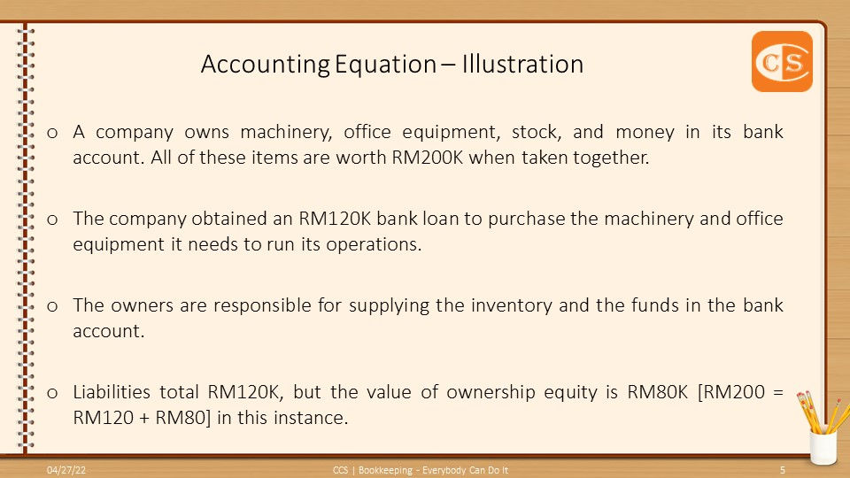 👉 Liabilities total RM120K, but the value of ownership equity is RM80K [RM200 = RM120 + RM80] in this instance.