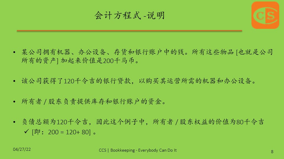 👉 刚刚起步的公司,经常会发现自己处于这种情况 [即:创业资金不够]。 5. 为了更好地理解会计方程式 [Accounting Equation] 背后的概念,我向你提供简单的说明 6. 说明: