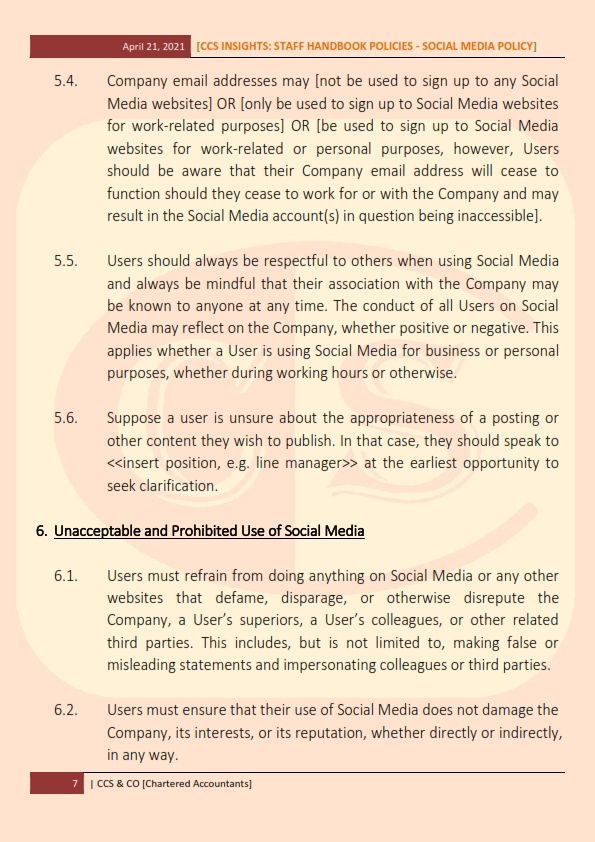 This Social Media Policy has been drafted as a stand-alone policy to govern employees’ usage of social media platforms while they are on the job. It is possible to use this in conjunction with the Communications, Email, and Internet Policy.