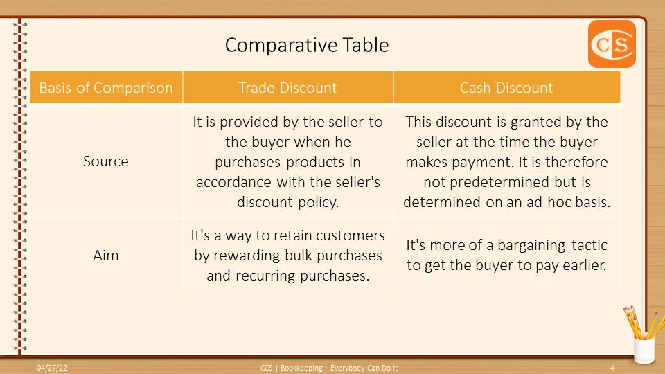 3. By contrast, a cash discount is a discount granted by a supplier to a buyer for cash payments to facilitate debt collection. The buyer will obtain the cash discount as long as they can pay the cash (debt) in advance within a set term.