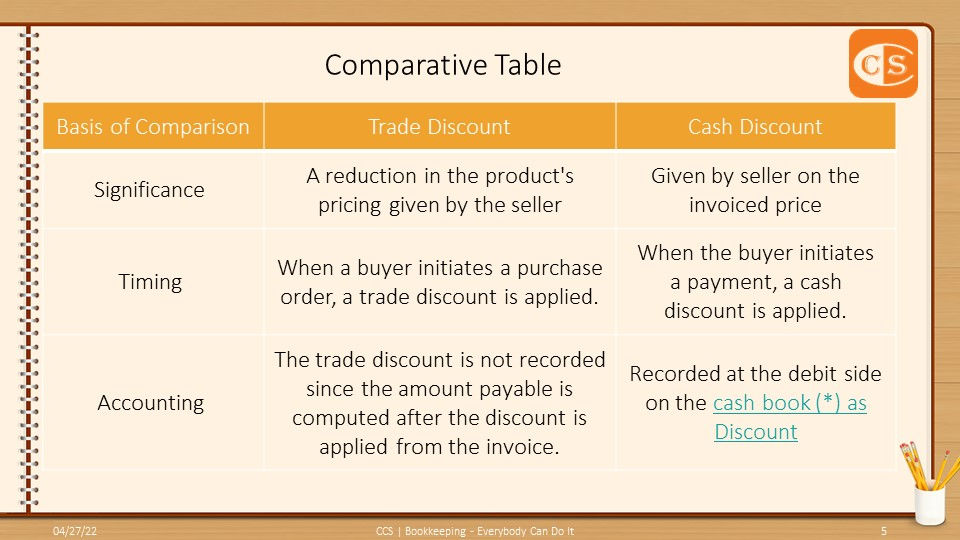 1. I’m assuming you’re aware that a discount is a reduction in the standard price of a good or service you purchase. However, did you know that there is a Trade Discount as well as a Cash Discount available?