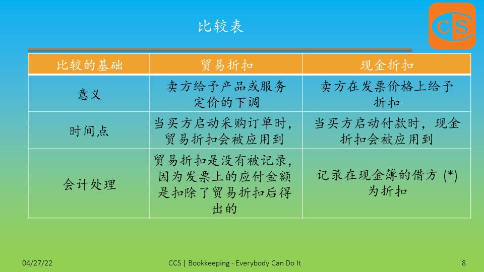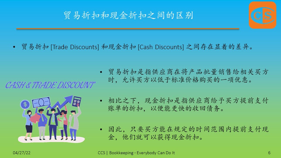 1. 我猜想你会知道,折扣是你在购买商品或服务时,从其标准价格所获取的回扣。然而,你是否知道,折扣其实有着两种类型,即贸易折扣 [Trade Discount] 和现金折扣 [Cash Discount] 吗?