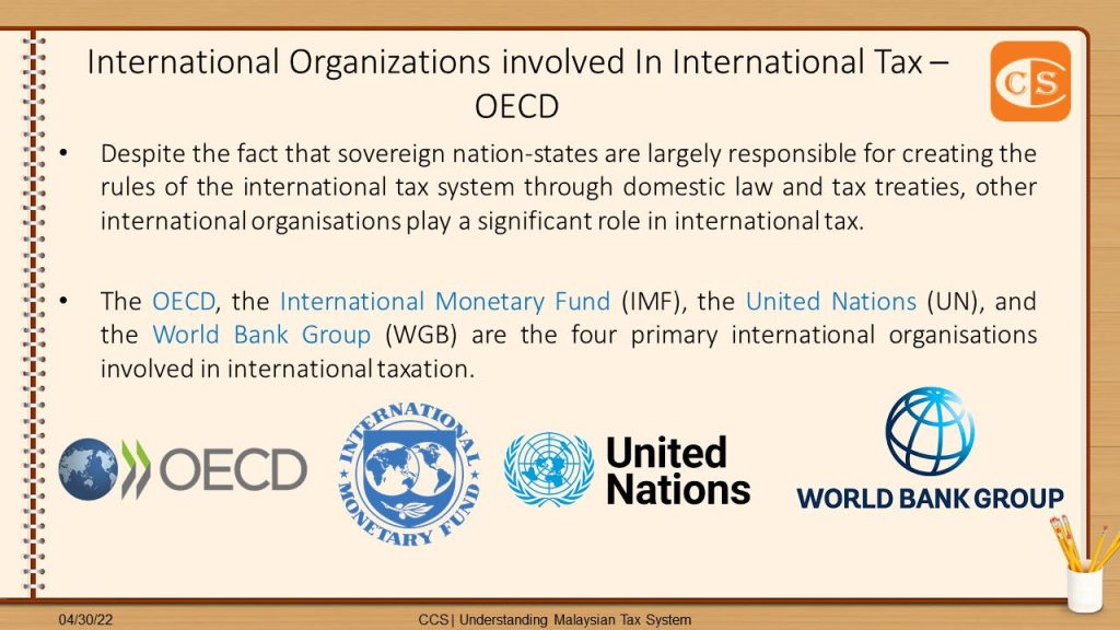 2. The OECD, the International Monetary Fund (IMF), the United Nations (UN), and the World Bank Group (WGB) are the four primary international organisations involved in international taxation.