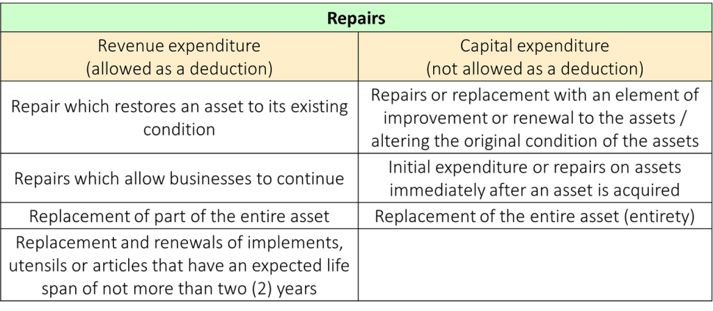 - 更新、修理或改造用于生产总收入的任何工具、器具或物品;然而就《1967年所得税法令》附表3而言,该支出属于合格设备支出的工具、器具或物品除外。