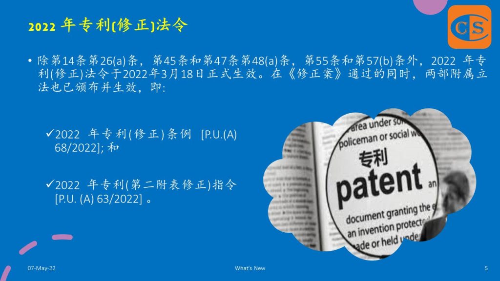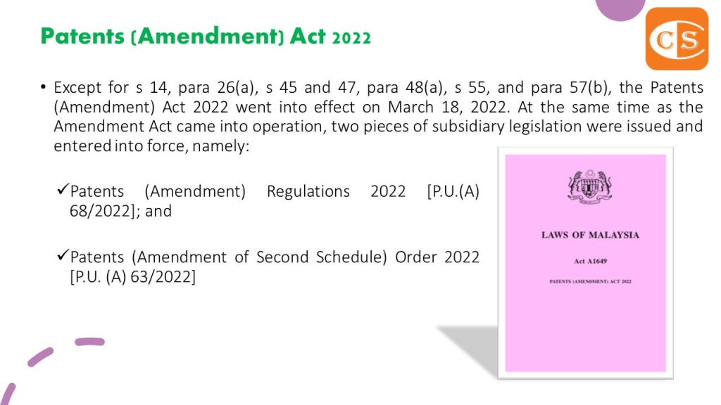 1. Except for s 14, para 26(a), s 45 and 47, para 48(a), s 55, and para 57(b), the Patents (Amendment) Act 2022 went into effect on March 18, 2022. At the same time as the Amendment Act came into operation, two pieces of subsidiary legislation were issued and entered into force, namely: