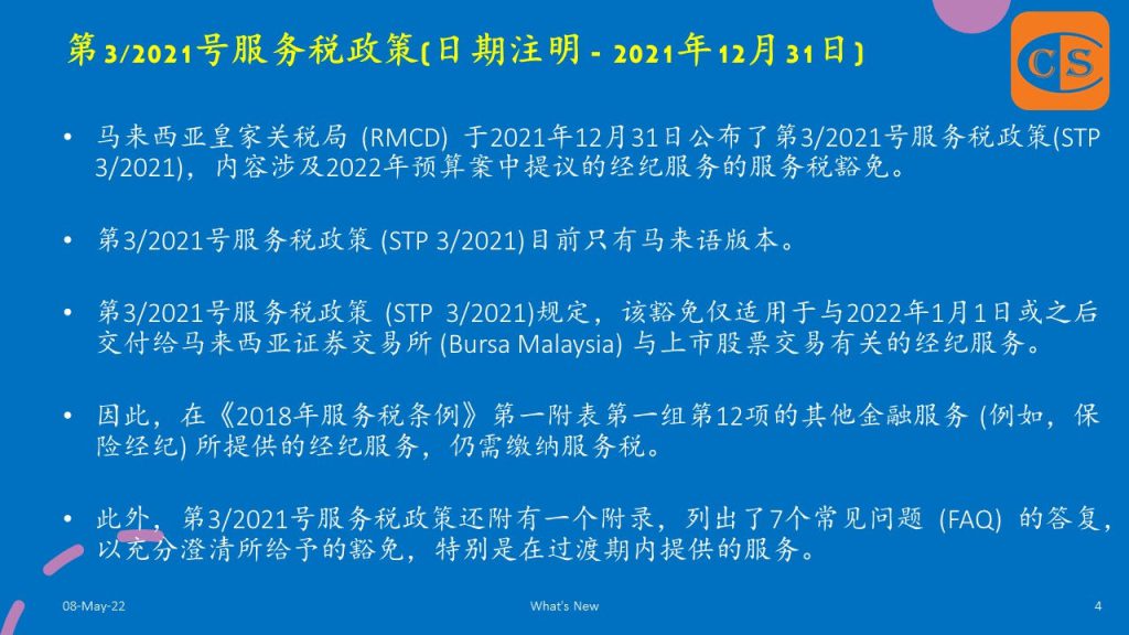 1. 马来西亚皇家关税局 (RMCD) 于2021年12月31日公布了第3/2021号服务税政策(STP 3/2021),内容涉及2022年预算案中提议的经纪服务的服务税豁免。