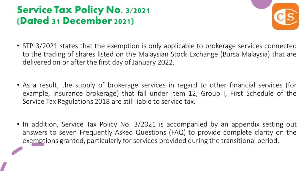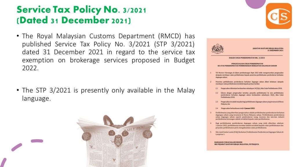 1. The Royal Malaysian Customs Department (RMCD) has published Service Tax Policy No. 3/2021 (STP 3/2021) dated 31 December 2021 in regard to the service tax exemption on brokerage services proposed in Budget 2022.