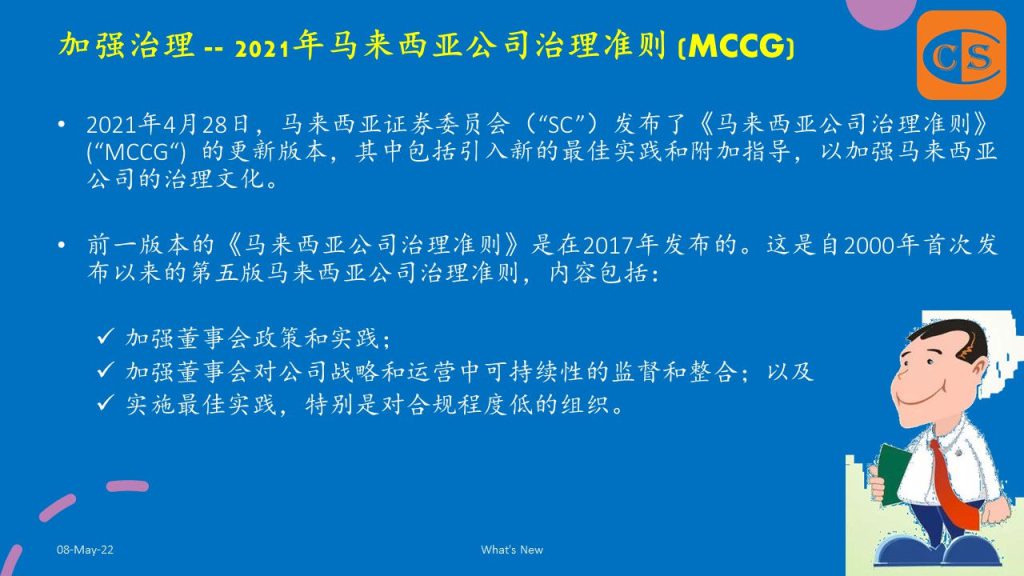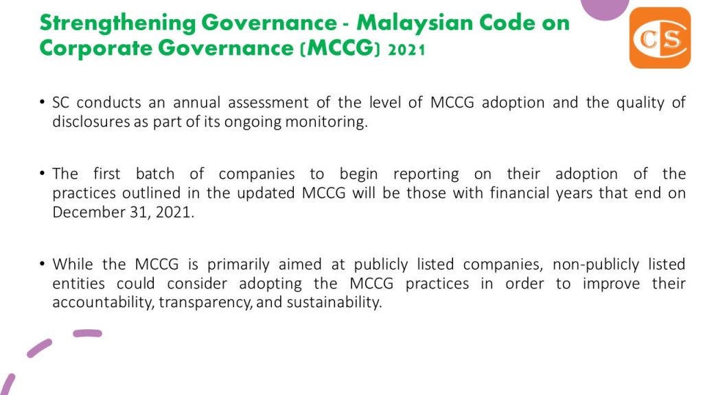 1. 2021年4月28日,马来西亚证券委员会(“SC”)发布了《马来西亚公司治理准则》(“MCCG“) 的更新版本,其中包括引入新的最佳实践和附加指导,以加强马来西亚公司的治理文化。