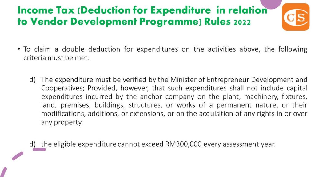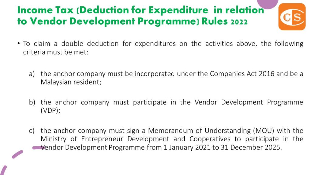 1. With effect from Year of Assessment 2021, Anchor Enterprises can claim double deductions for eligible expenses made to encourage increased participation in the development of local vendors.