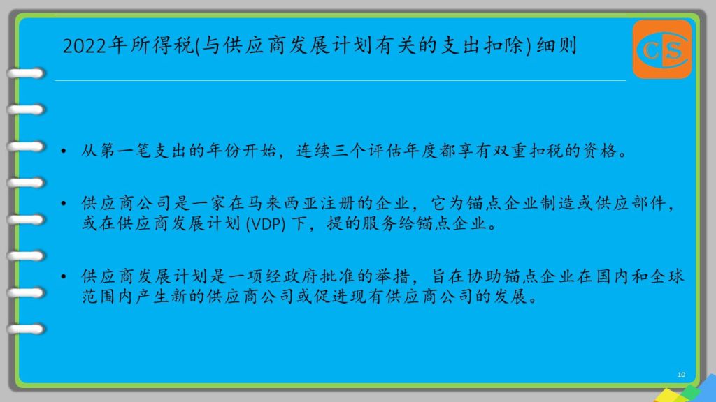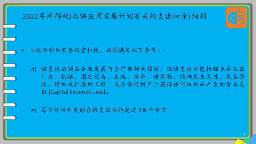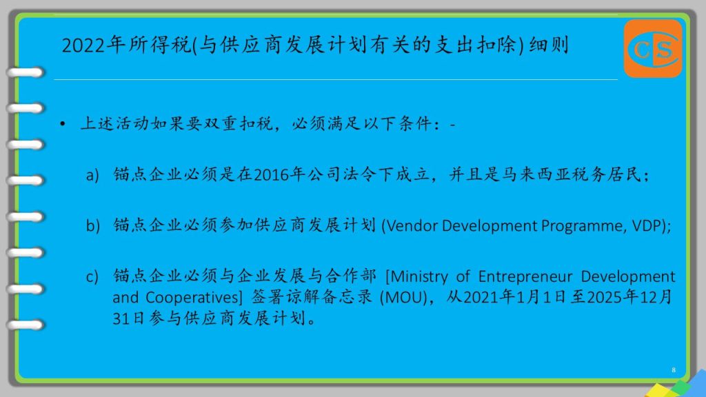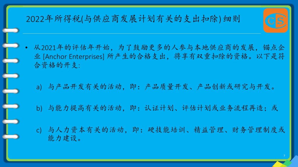 1. 从2021年的评估年开始,为了鼓励更多的人参与本地供应商的发展,锚点企业 [Anchor Enterprises] 所产生的合格支出,将享有双重扣除的资格。