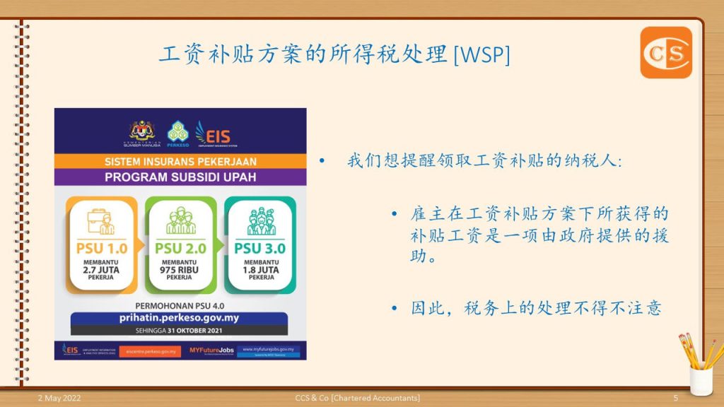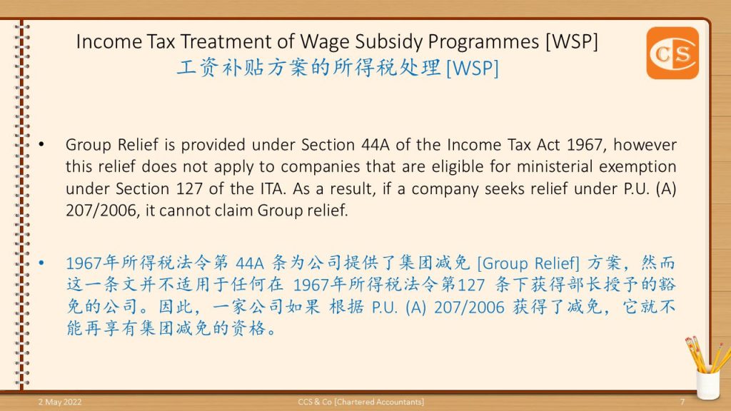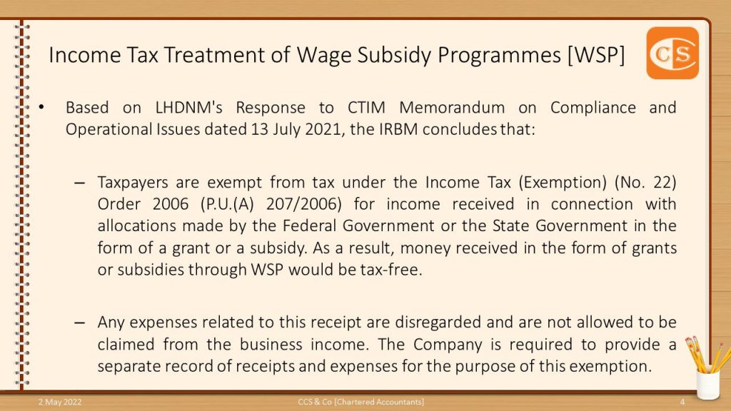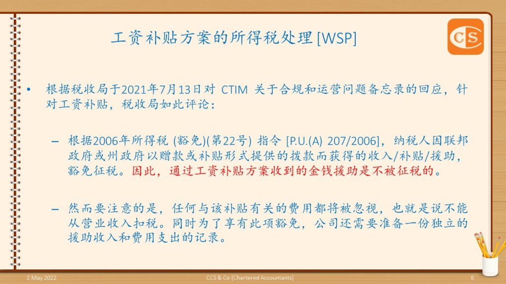 👉 雇主在工资补贴方案下所获得的补贴工资是由政府提供的一项援助。 👉 因此,税务上的处理,不得不注意 2. 根据2006年所得税 (豁免)(第22号) 指令 [P.U.(A) 207/2006],纳税人因联邦政府或州政府以赠款或补贴形式提供的拨款而获得的收入/补贴/援助,豁免纳税。