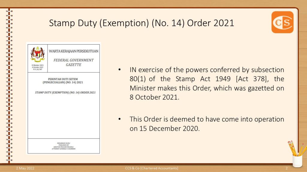 2. The Minister issues this Order, which was gazetted on October 8, 2021, in the exercise of the powers granted by subsection 80(1) of the Stamp Act 1949 [Act 378].