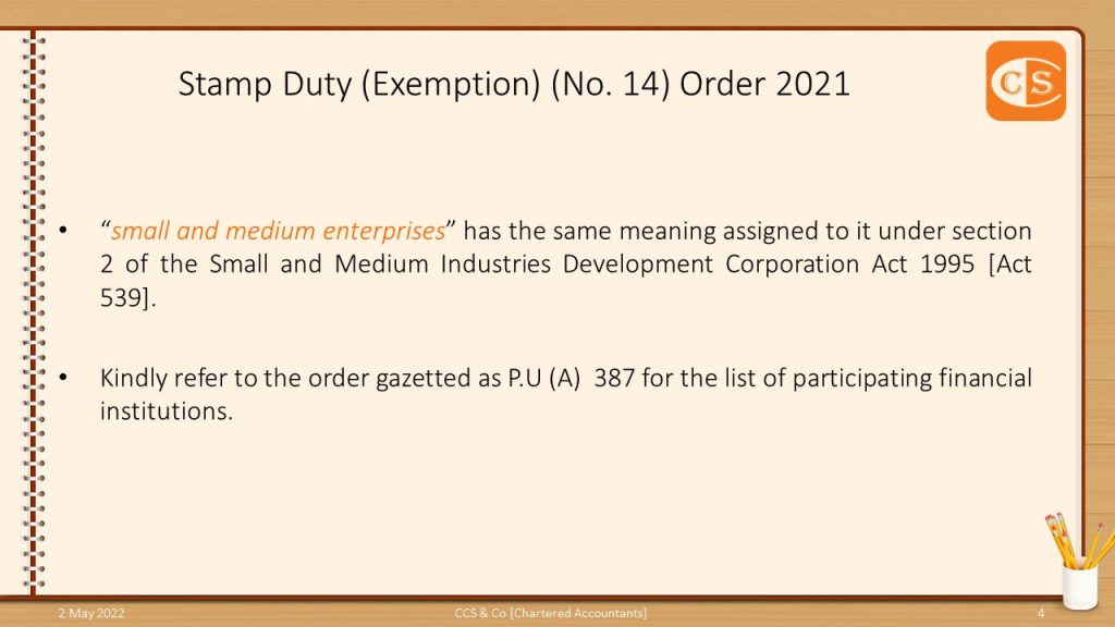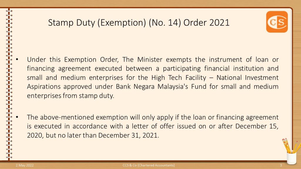 4. Under this Exemption Order, The Minister exempts the instrument of loan or financing agreement executed between a participating financial institution and small and medium enterprises for the High Tech Facility – National Investment Aspirations approved under Bank Negara Malaysia’s Fund for small and medium enterprises from stamp duty.