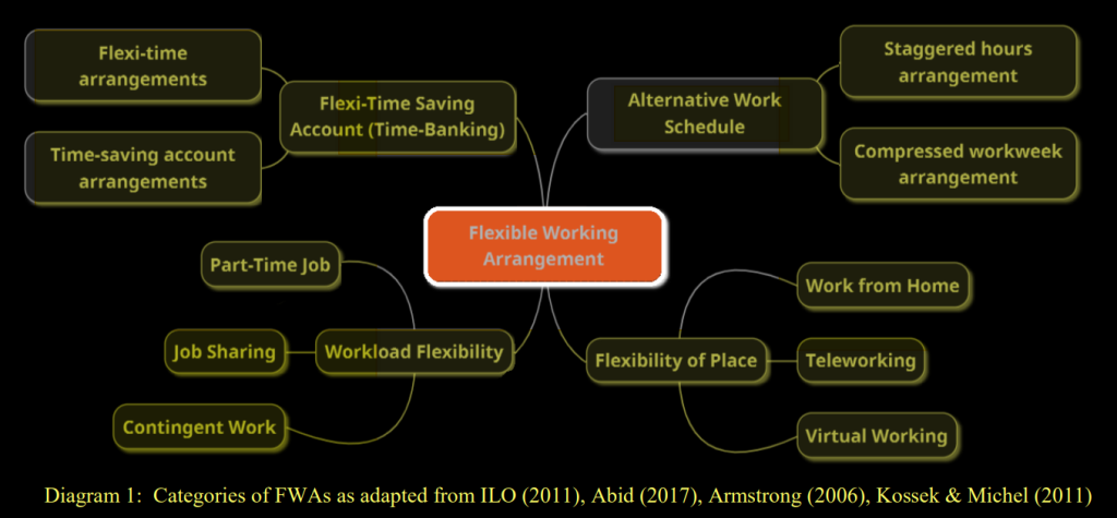 In contrast to traditional work arrangements, which generally require employees to work at a standard period from 8 am to 5 pm, Monday through Friday, or at their usual workplace, FWA is a variable and changeable work in terms of its schedule or the nature of the working environment.